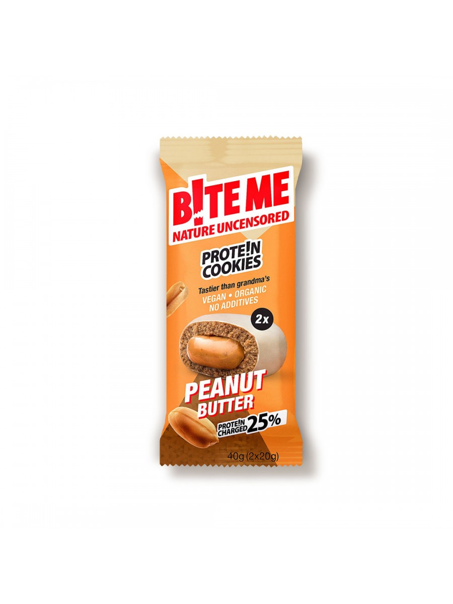 Organiczne wegańskie ciasteczka proteinowe z nadzieniem z masła orzechowego oraz 25% dodatkiem białka grochu.