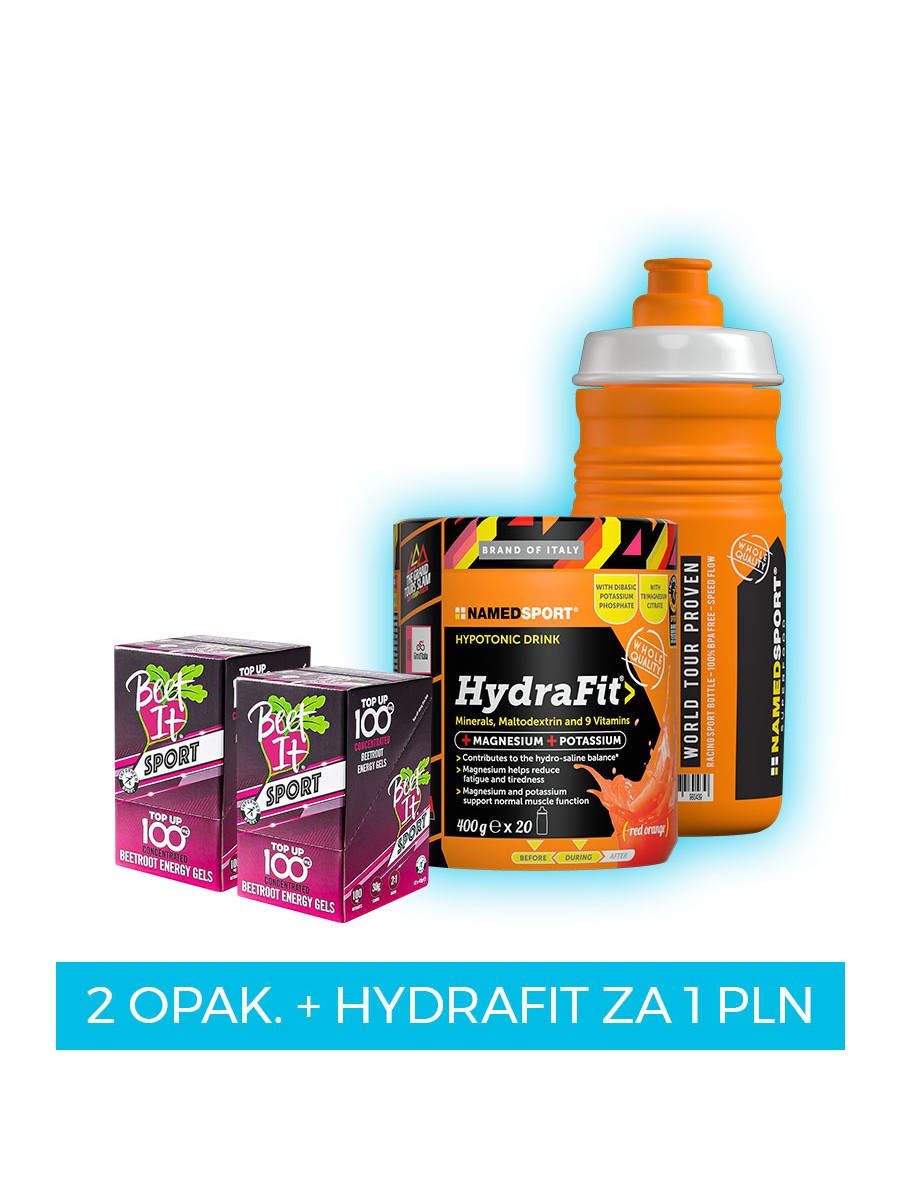 Zestaw promocyjny zawierający 2 opakowania (24 żele) Beet It Sport Gel - skoncentrowany żel energetyczny z buraka, który zawiera 100 mg azotanów, 150 mg sodu oraz 30 g łatwo przyswajalnych węglowodanów (w proporcji 2:1 glukoza do fruktozy) oraz flagowy hipotonik marki NAMEDSPORT> - HydraFit (w zestawie za 1 zł).