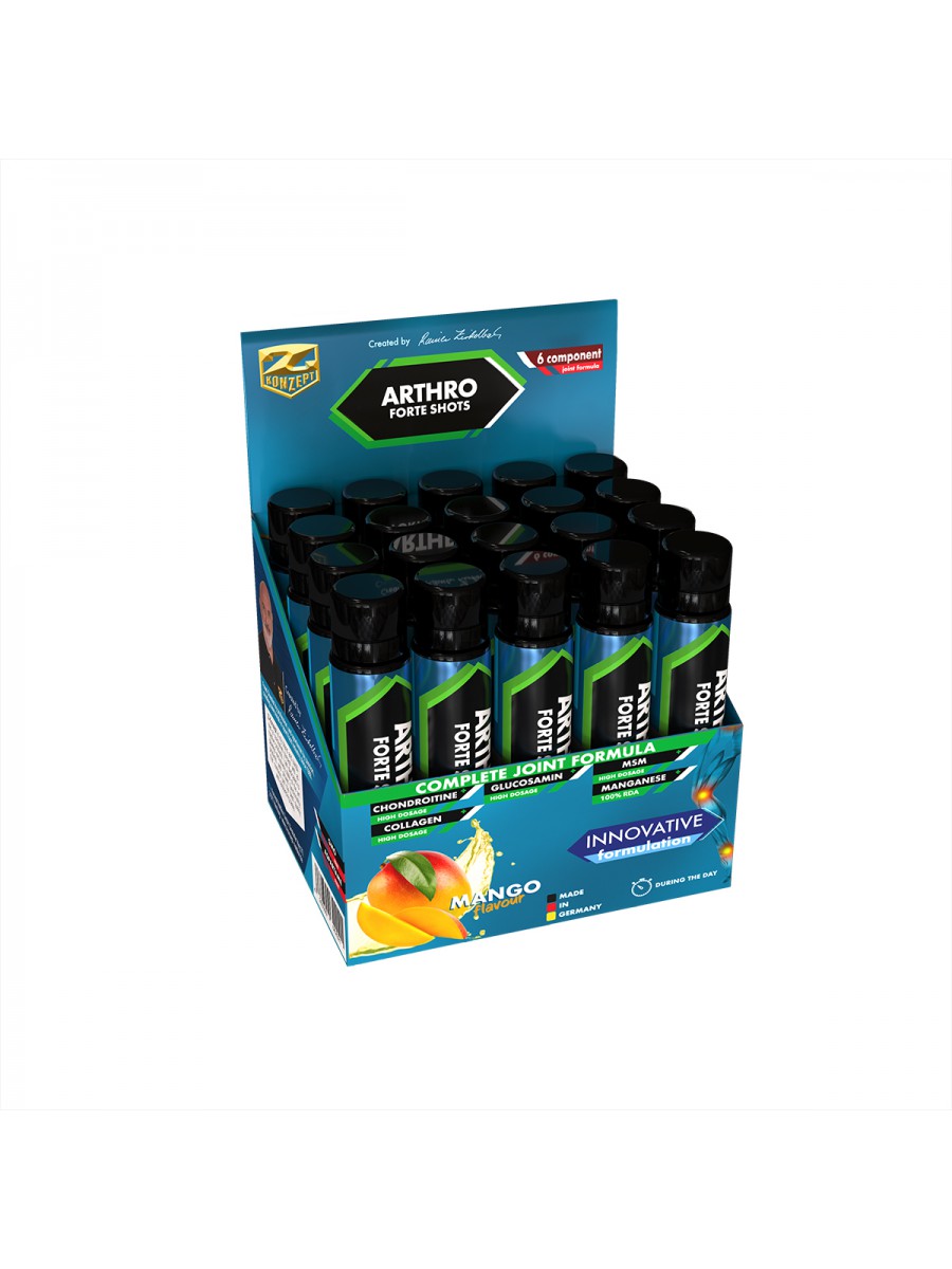 Koncentrat o delikatnym owocowym smaku, który nadaje zawarty w nim miąższ z mango. W Artho Forte Shots połączone zostały wszystkie dostępne składniki mające wpływ na stawy. Są nimi siarczan glukozaminy, siarczan chondroityny, metylosulfonylometan (MSM), kolagen i siarczan manganu. Istotnym budulcem chrząstki są zawarte w shotach: glukozamina,, chondroityna i MSM (która dostarcza siarkę). Ponadto hydrolizat Artho Forte zawiera kolagen, który jest białkiem strukturalnym, odpowiedzialnym za elastyczność i szczelność tkanki łącznej. Zawarty w koncentracie mangan przyczynia się do prawidłowego tworzenia tkanki łącznej i wzmocnienia kości.