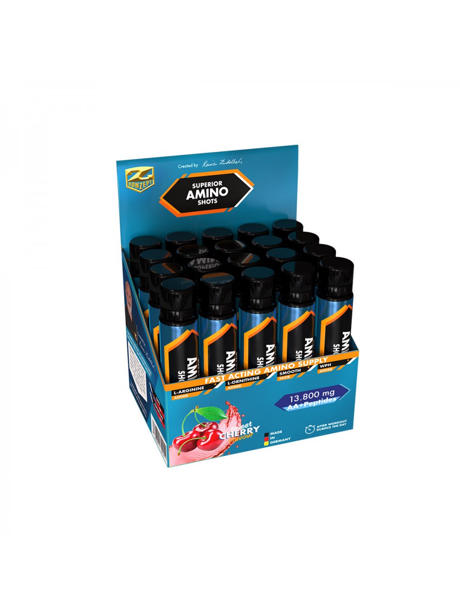 Superior Amino Shots to skoncentrowany hydrolizat białka, dostarcza szybko przyswajalnych aminokwasów (takich samych, jak w Mega Amino Liquid) oraz peptydów (13 620 mg) zawartych w jednej ampułce. Suplement zapewnia szybkie wsparcie dla zapotrzebowania na białko oraz dodatkowo wzbogacony jest o L-ornitynę i L-argininę. Superior Amino shots szybko zaspokaja niedobór aminokwasów i minimalizuje urazy włókien mięśniowych, co znacząco wpływa na procesy regeneracji w tkankach. Zachowuje znakomity smak pomimo wysokiej zawartości aminokwasów.