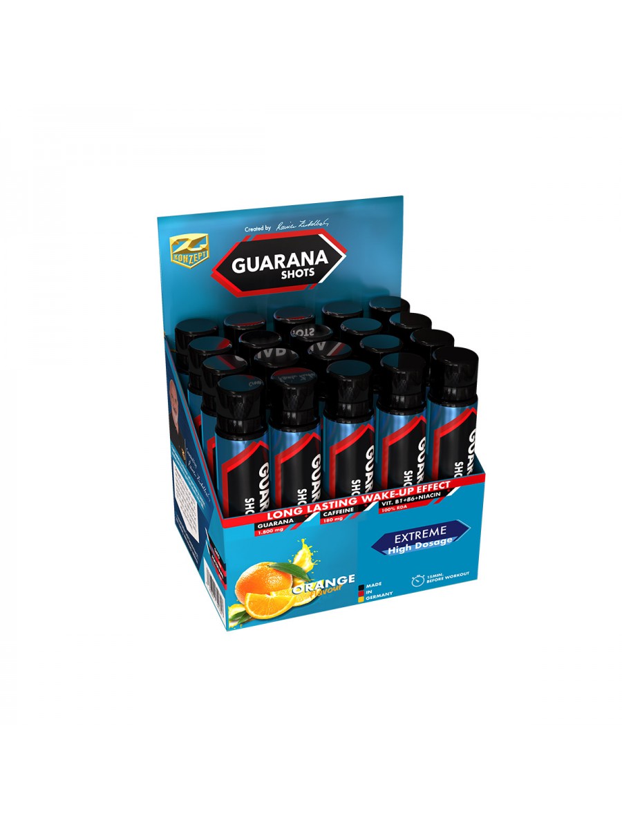 Guarana Shot, dzięki płynnej formie, pozwala na szybsze uwalnianie składników, niż ma to miejsce w przypadku tabletek, przy jednoczesnym zachowaniu długotrwałego efektu. Guarana powstaje z suszonych i obranych nasion rośliny Paullinia guarana. Pochodzi z Amazonii, gdzie była wykorzystywana przez tubylców tego regionu w celu złagodzenia apetytu i zmęczenia. Efekt ten jest wynikiem łagodniejszego i dłuższego działania kofeiny niż w kawie. W Guarana Shots 1.800 użyty został ekstrakt guarany najwyższej jakości, uzyskując tym samym najwyższy na rynku poziom kofeiny (180 mg kofeiny to trzy filiżanki kawy).